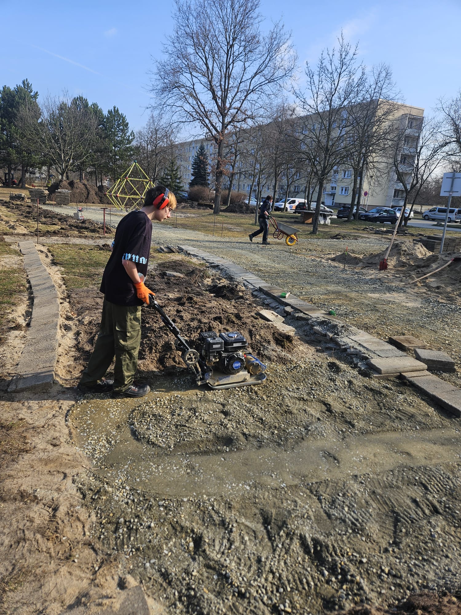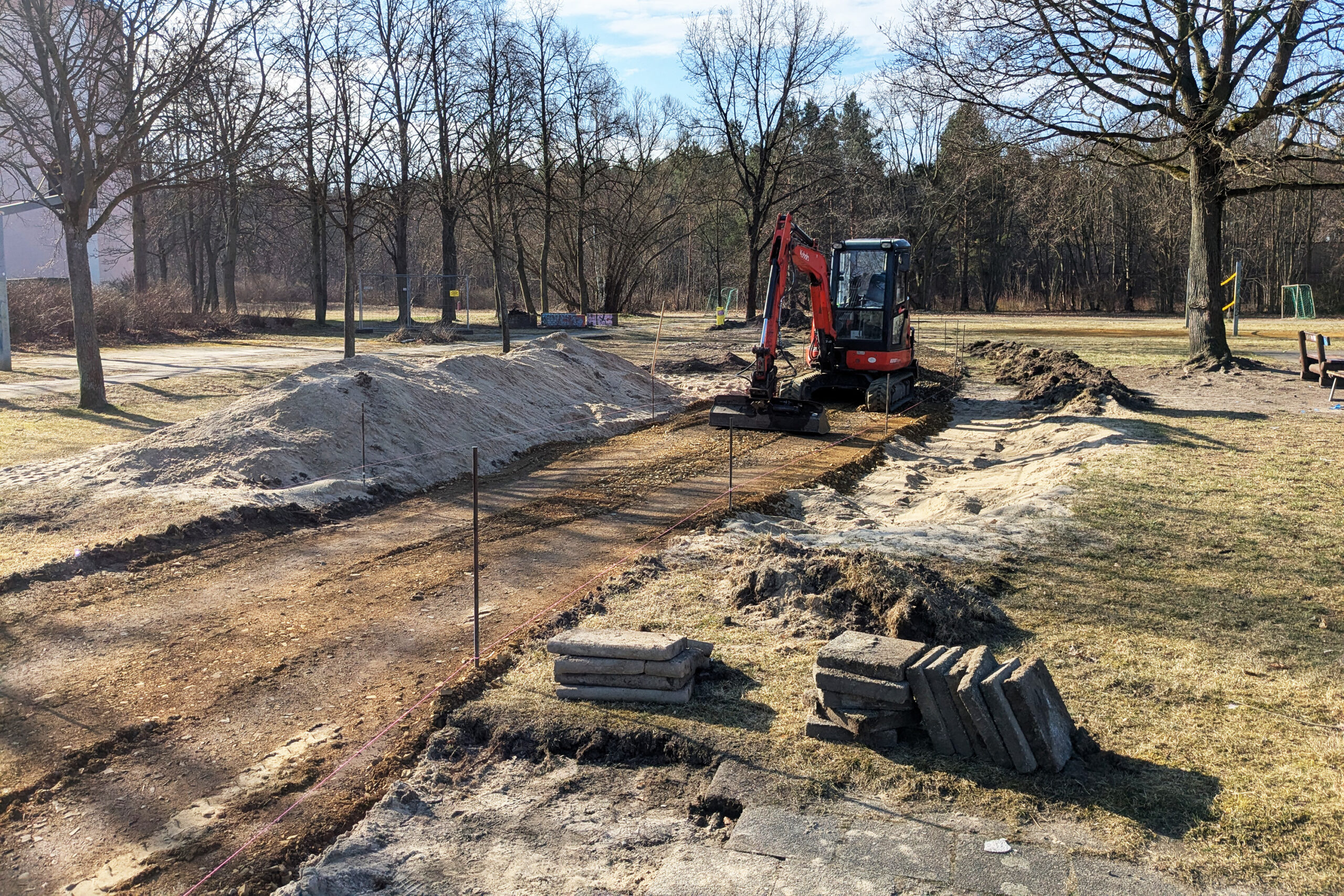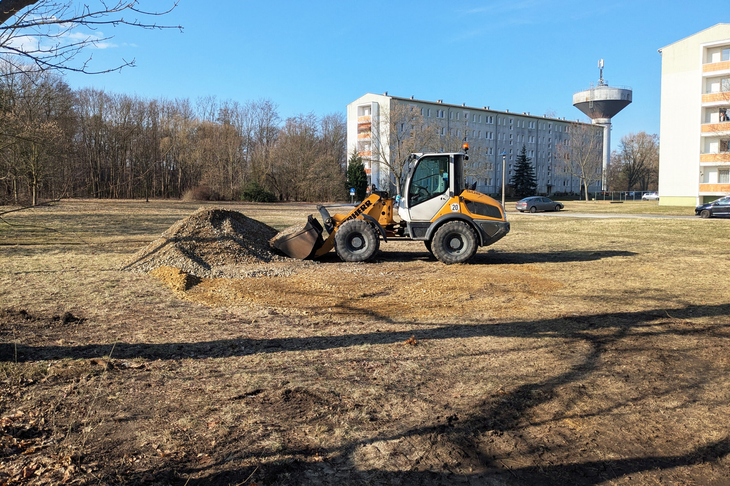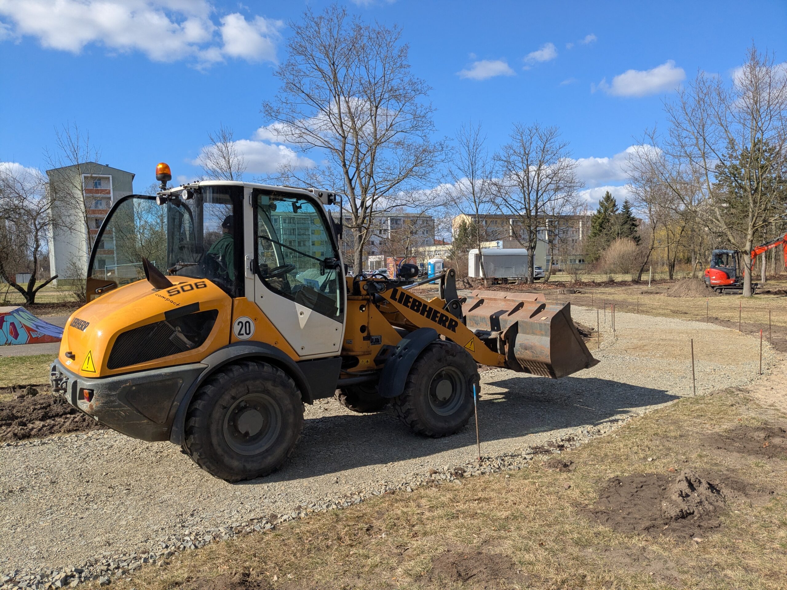 Am Skaterplatz arbeiten jetzt Bagger und Radlader. Sie legen die neuen Wege an und formen das Gelände. Der Platz verändert sich damit Schritt für Schritt und wird zur Mitmachbaustelle.